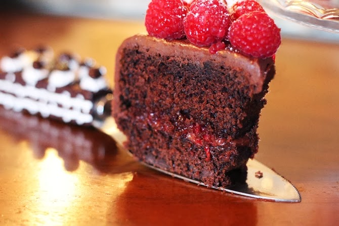 Colocar a outra metade do bolo em cima e barrar o restante creme de chocolate envolvendo todo o bolo. Terminar com as framboesas frescas.