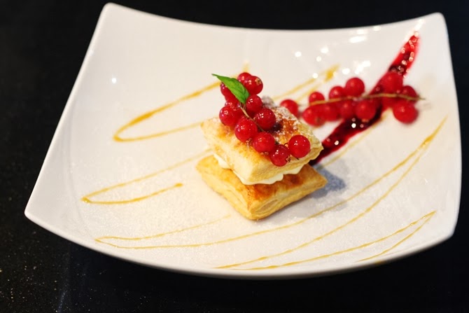 Arrange on a serving plate a strand of red fruit syrup, a square of puff pastry and cream with the help of a beaded mouthpiece. Finish with caramel, powdered sugar dusted, fresh red currants and mint leaves.